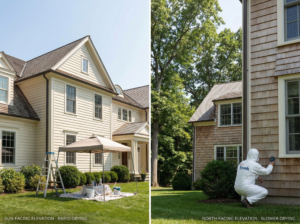 New Canaan has a mix of open exposures and wooded properties. That changes drying time: a sun-facing wall can be ready while a shaded elevation remains damp. The practical impact is sequencing and patience—especially after rain. Homeowners who try to “force” the schedule often see uneven weathering later, where one side holds up and the other side shows mildew staining or edge failure first.