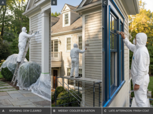 A strong crew doesn’t treat the house as one surface. They move across elevations based on exposure: they wait for shade sides to fully dry, avoid sun-baked walls during peak heat, and plan stopping points that keep the site protected if weather shifts. This is how timing becomes a durability tool, not just a calendar decision.